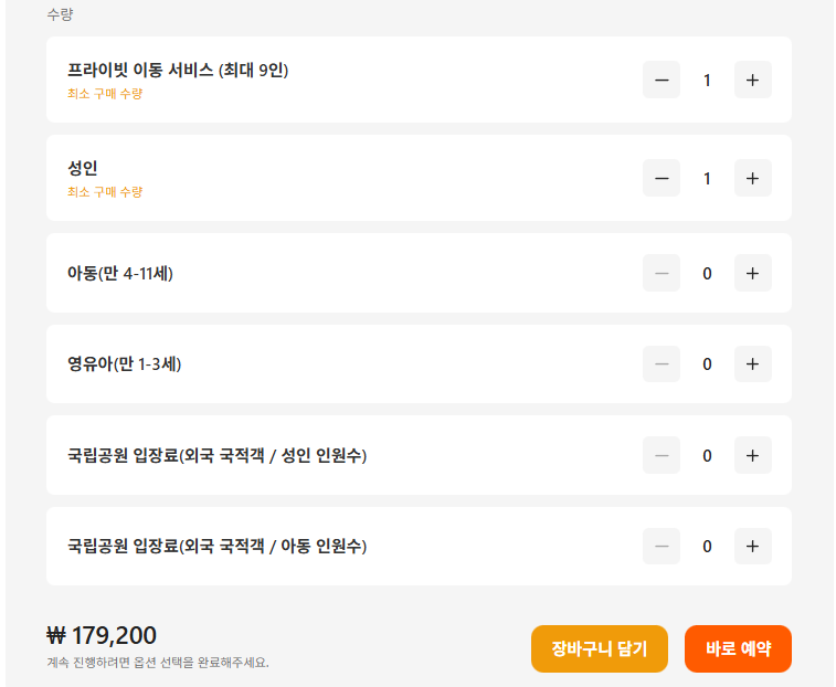 우선 외국 국적자의 경우 국립공원 입장료가 별도이거나 옵션에서 선택해야 하는 경우가 많으니 확인이 필요합니다.
